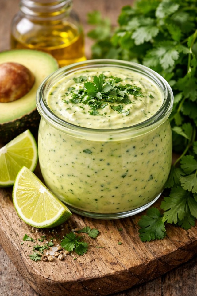 Voeg het limoensap, de olijfolie en de kruiden toe en mix tot een gladde dressing.