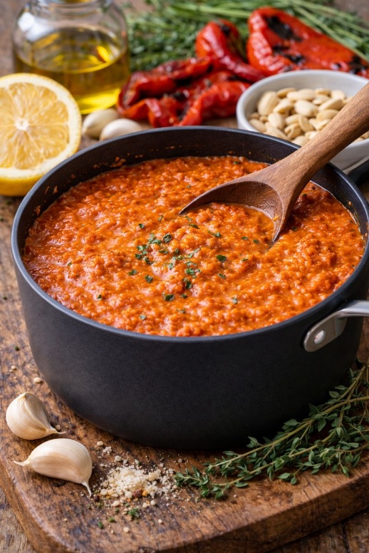 Doe de geroosterde paprika samen met het amandelmeel of de amandelen in een blender.